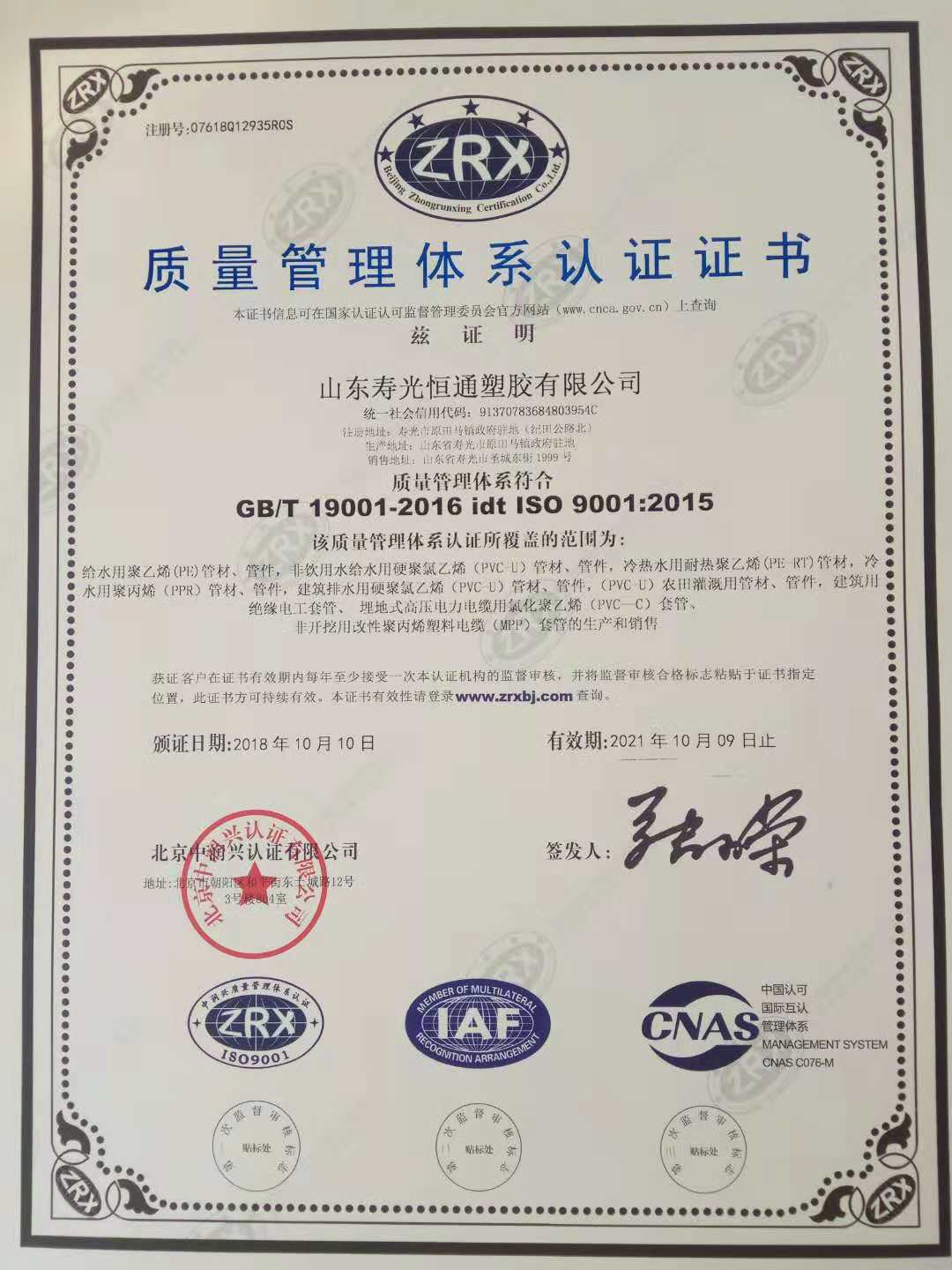 質(zhì)量管理體系認證證書