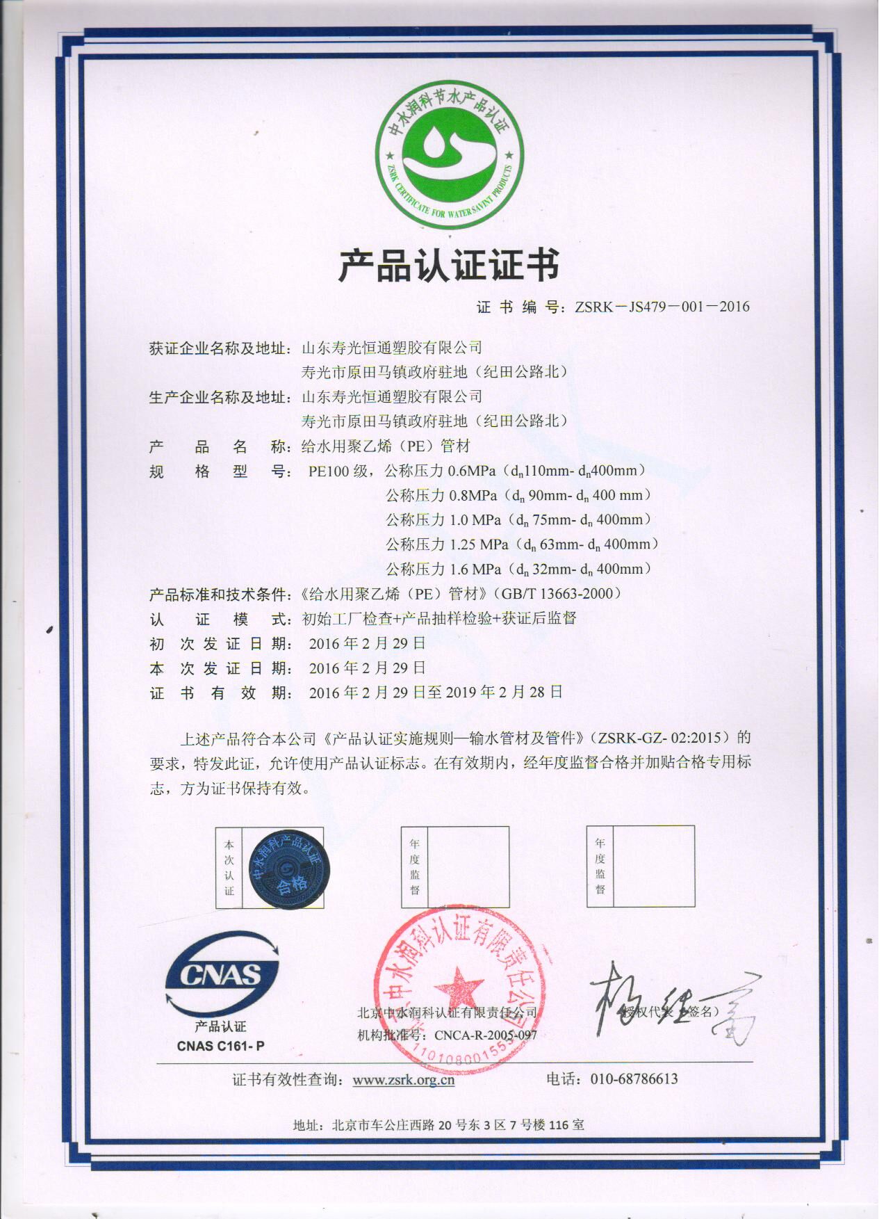 PE管材產(chǎn)品北京中水認(rèn)證證書