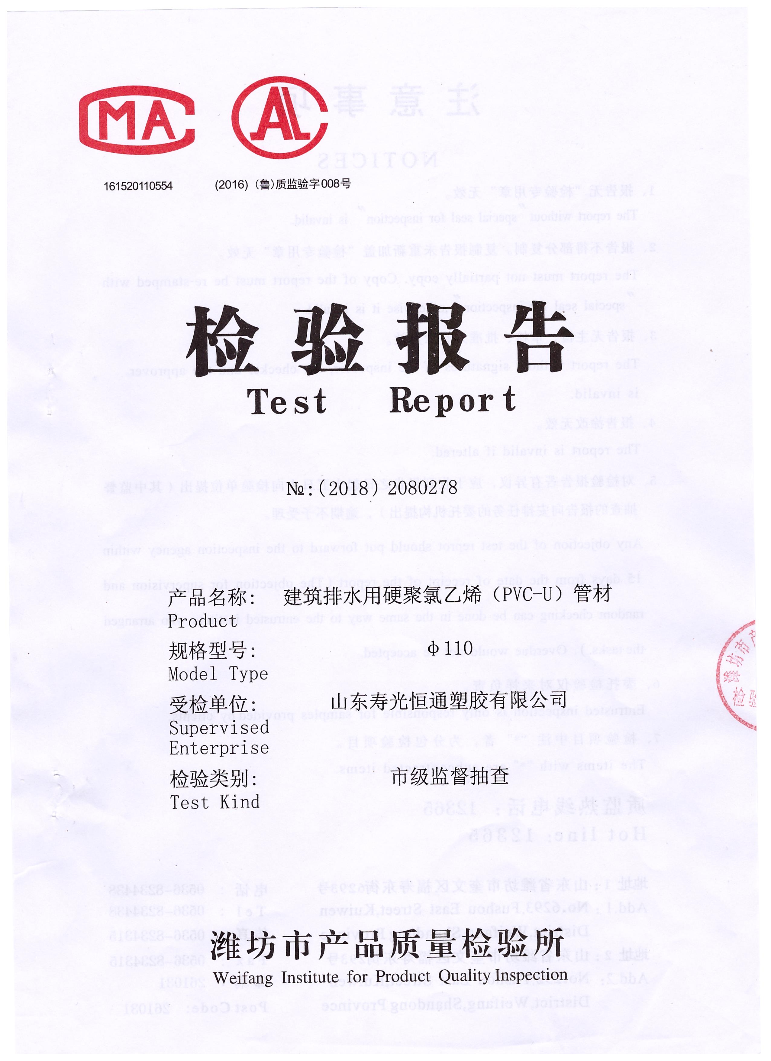 PVC160排水管山東省檢測報告山東壽光恒通塑膠主要生產(chǎn):PVC排水管材、管件;HDPE管材、管件、地源熱泵管;PP-R冷熱水管材、管件;PR-RT地暖管材;PVC-U給水管材、管件;農(nóng)田灌溉管;絕緣電工套管、電力通訊管;大口徑…